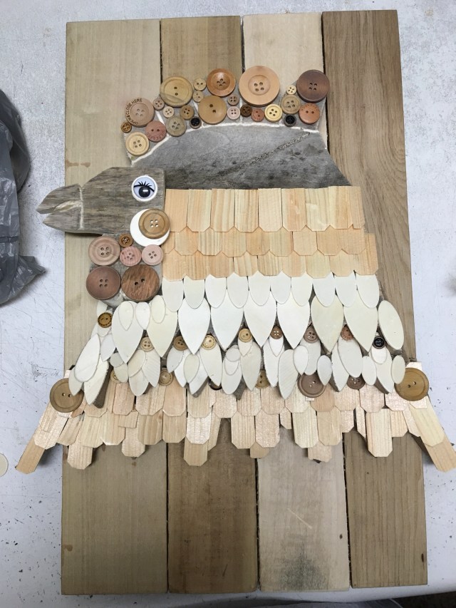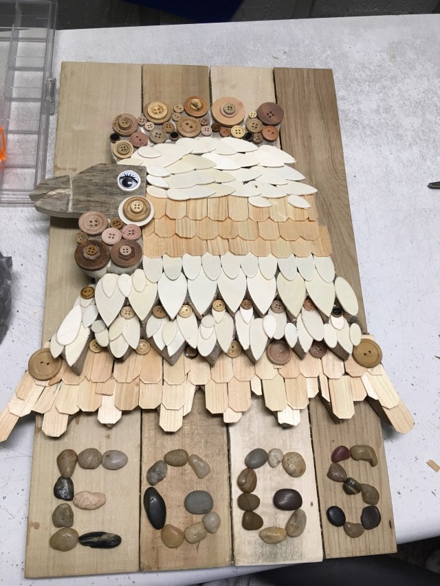 With some river rock I completed the piece with EGGS being spelled out. From start to finish it took longer to find the decor than to build or apply it. I also got a one of a kind piece made with love by me and my family.