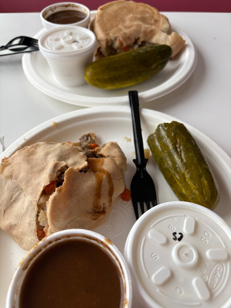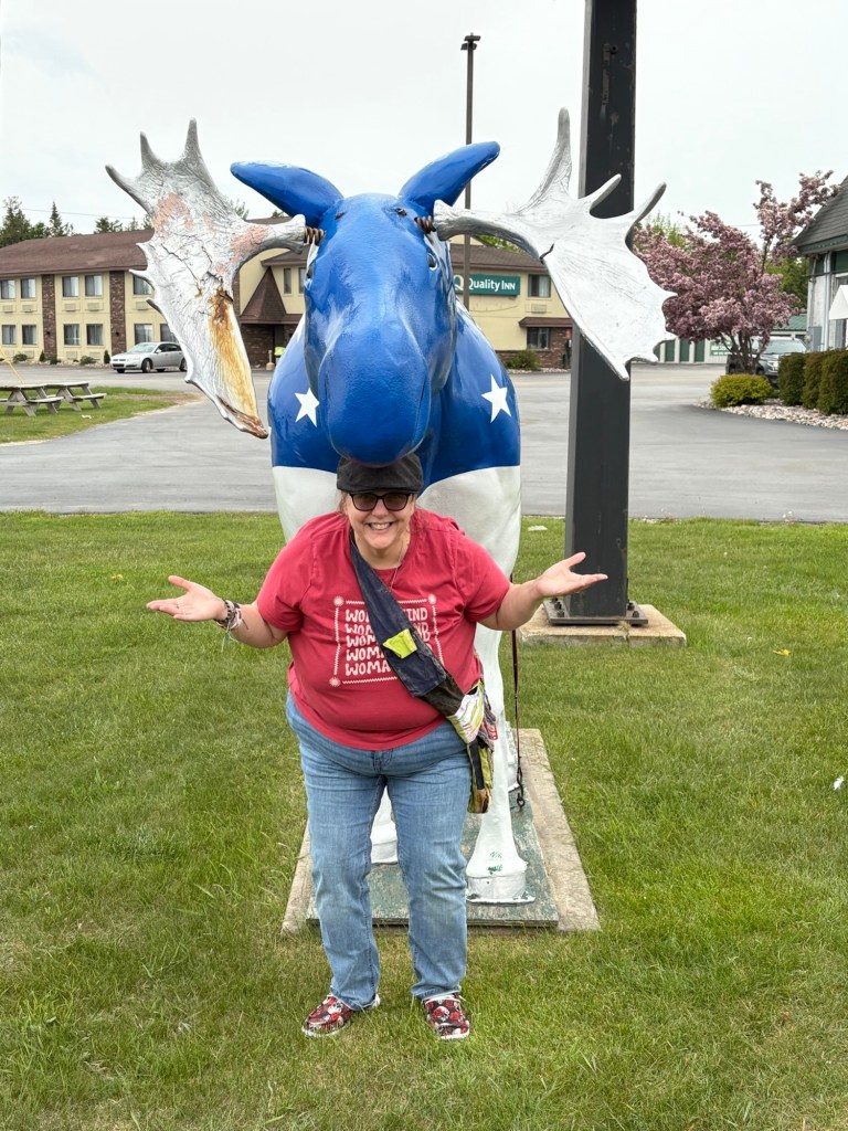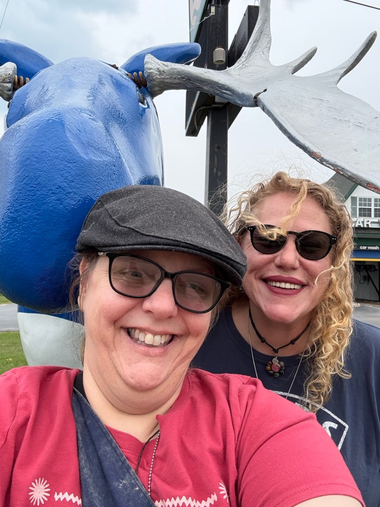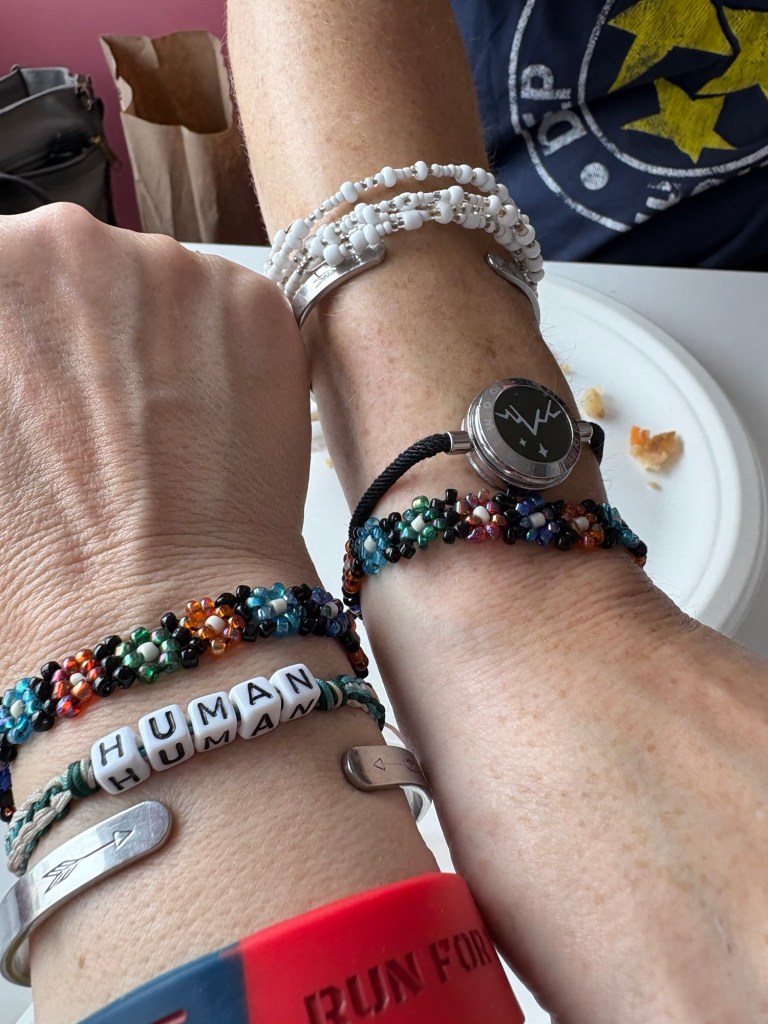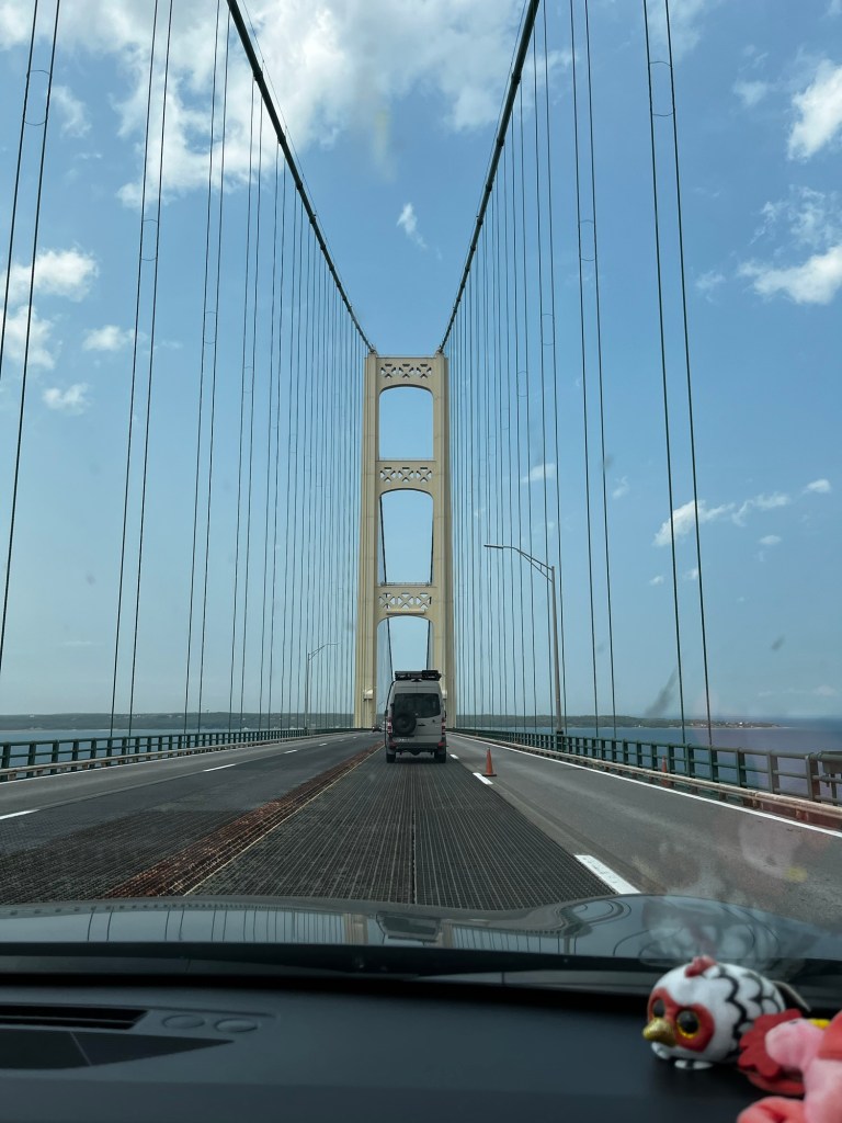 The start of our journey was optimistic and great vibes. The day was brilliant with sunshine. Pine trees for miles. Excellent journey. I’m on the left, Suey is beaming in the center, Bebop is in the buffalo plaid, and Madam President Jen is glistening. Met for drinks and dessert with the second batch of my fellow Poll Dancers. Earlier we broke bread with Lynda and spent time shopping for our church meeting.Just south of Cadillac, MI, Bestie doing her best Vanna White.The black spot on my teeth is a blueberry from the pancakes my loving dad made for us this morning. The grin we share is because we’re almost to the Mighty Mac.We are driving on the bridge between the Upper and Lower Peninsula of Michigan. The bridge sings a song of descending tones the slower you go. We should nickname this trip “Left Lane Closed.”We made it! Woot! Yeehaw! $4 to drive that bridge. It’s a tourist trap. This is a pasty. It’s a meat pie with potatoes, rutabaga, carrots, and traditional spices. This was a 7 on my scale. This one was dry even with gravy. Jen was not a fan, so…She got us matching bracelets! Then we had to find her a place to eat.A woman recommended this place. Jen ordered a cheeseburger 🍔 and Jalapeño poppers. She rated the burger an 8/10. The meat had a really good good flavor which got overpowered by the condiments. The poppers were large and juicy but overpriced. 8/10. Overall a solid 8 on the scale of Jen.Note they serve POP here, not coke or soda, just POP.