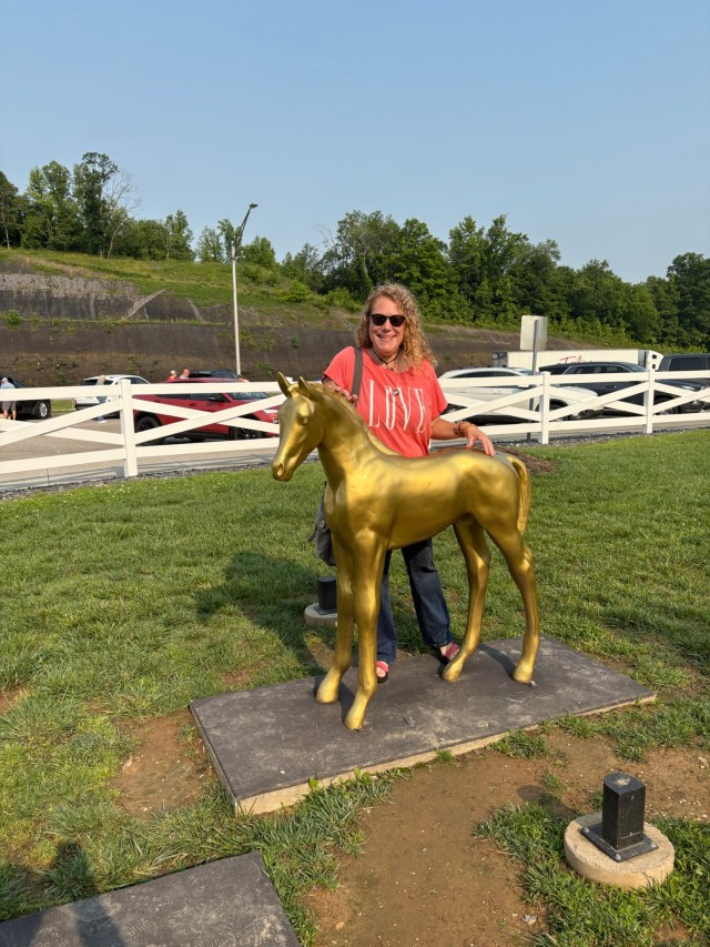 The Welcome Center just over the Kentucky State Line. It appears there used to be a large golden horse on an empty base, but all that’s left is this little fella. We look like cartoon charicatures of ourselves in this one.