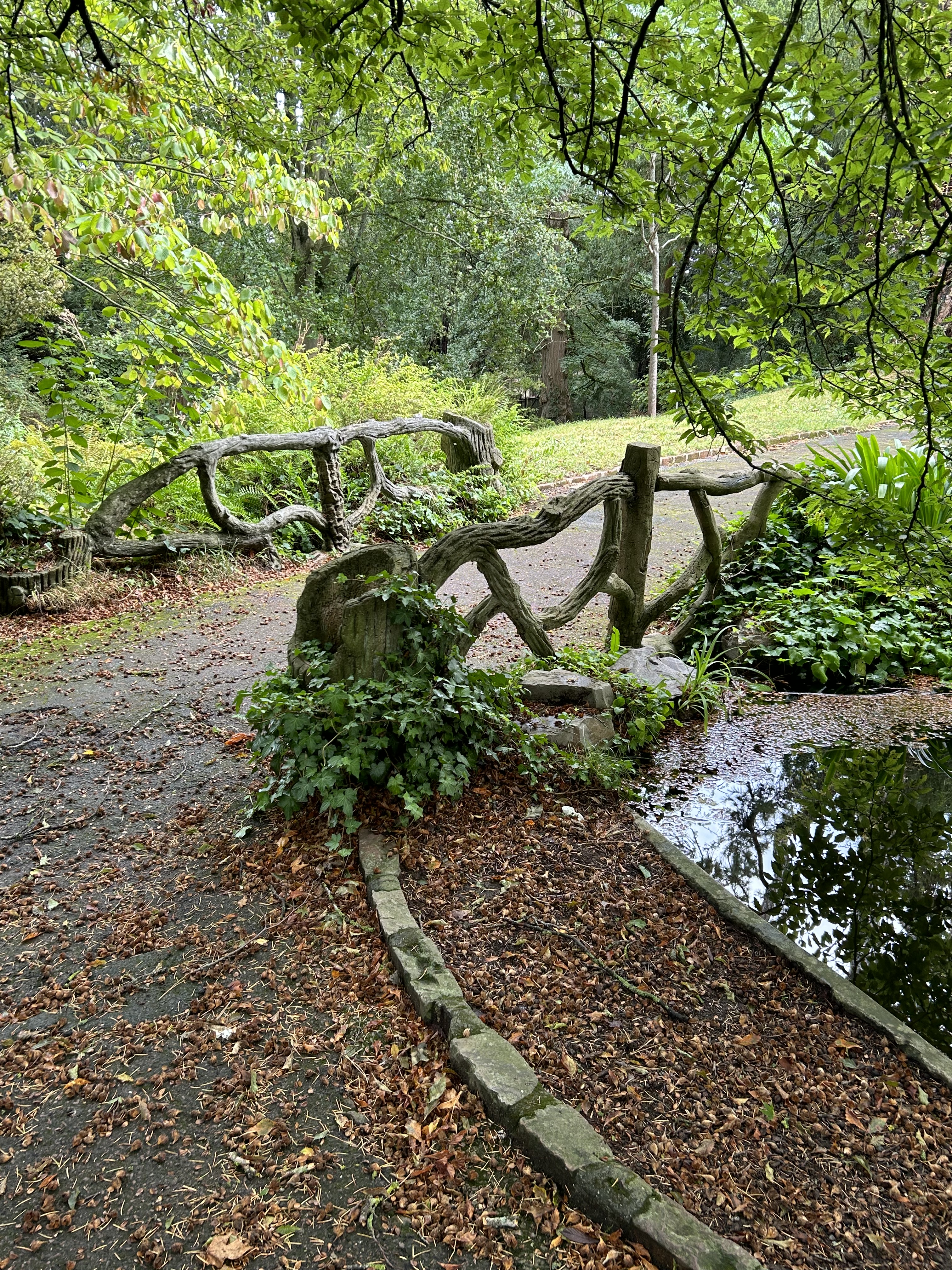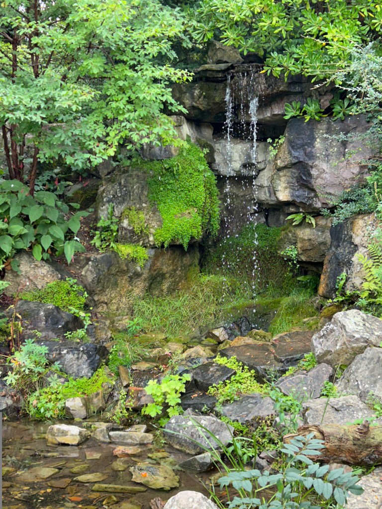 The music of water called to me. I heeded the melody to an eight foot tall cascade tumbling languidly into a shallow pond. I wanted to sit and watch the waterfall, but the carved log bench across from it had been knocked off its base and was resting in an awkward angle removing that possibility.