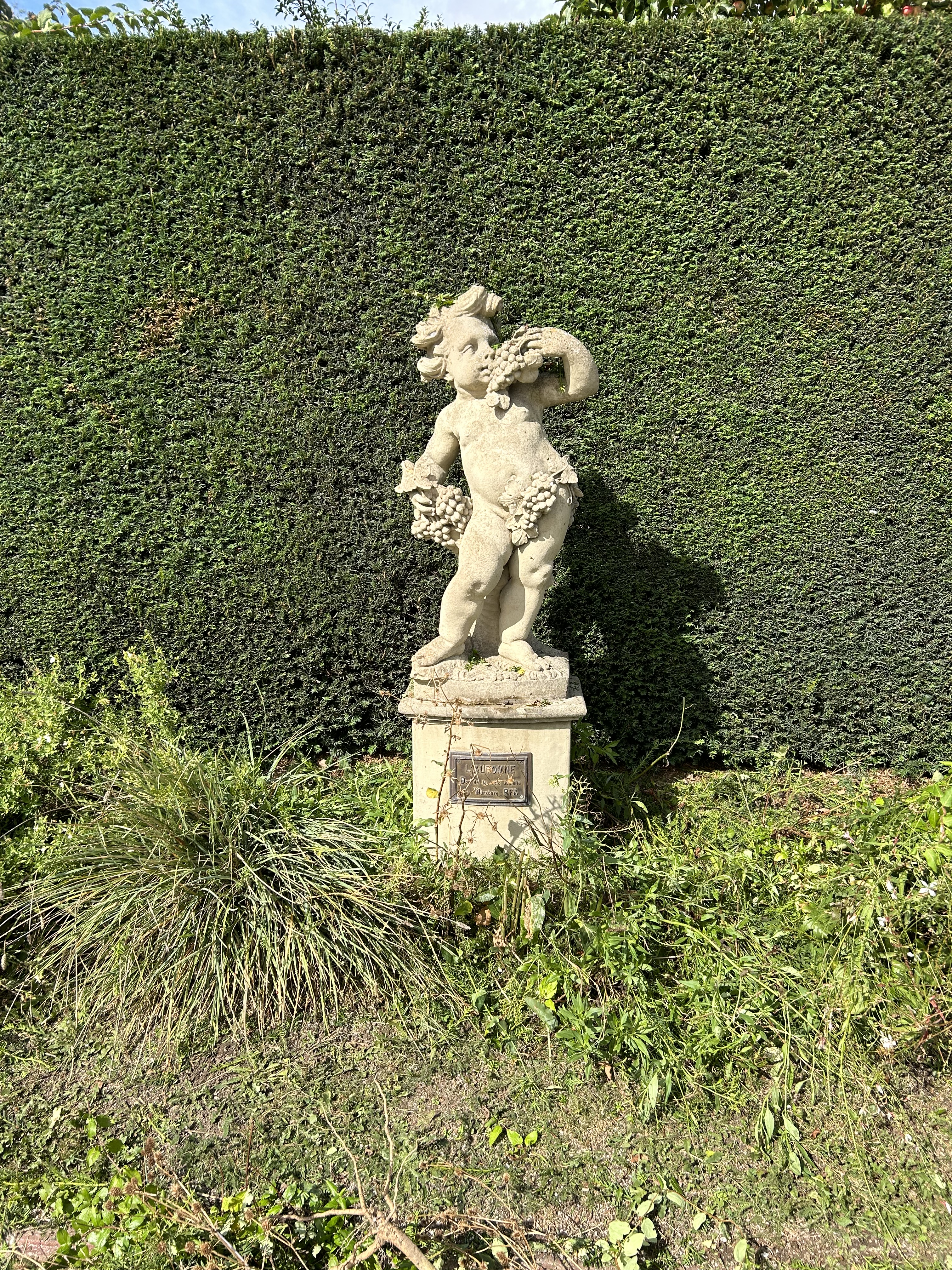 The neatly trimmed hedges that give background to these was being trimmed by a man on a very tall ladder. They are precisely cut to 90 degree angles at the top, forming a box-like structure to them.