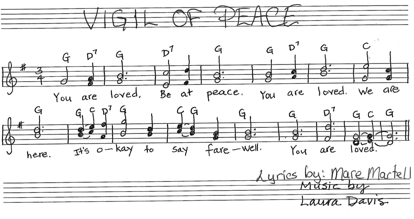 I approached Laura Davis, a person I’ve collaborated with in the past, with lyrics for a simple bedside song that could be sung as easy as “Happy Birthday”. She didn’t disappoint. Below is the music and lyrics for you to use as you need to. I sing a slight variation of notes than is written, but that’s because I’m a mediocre singer with delusions of grandeur.
