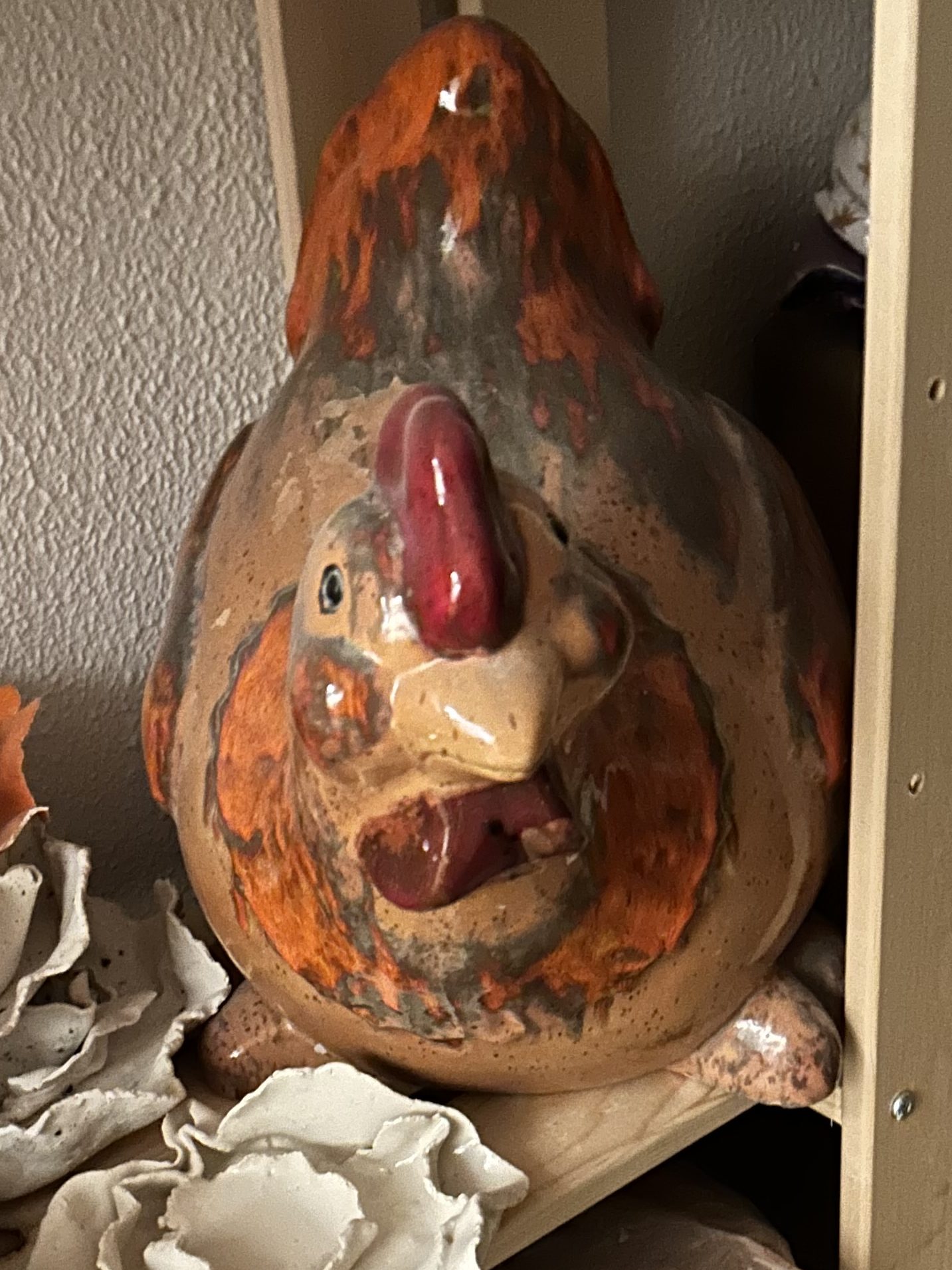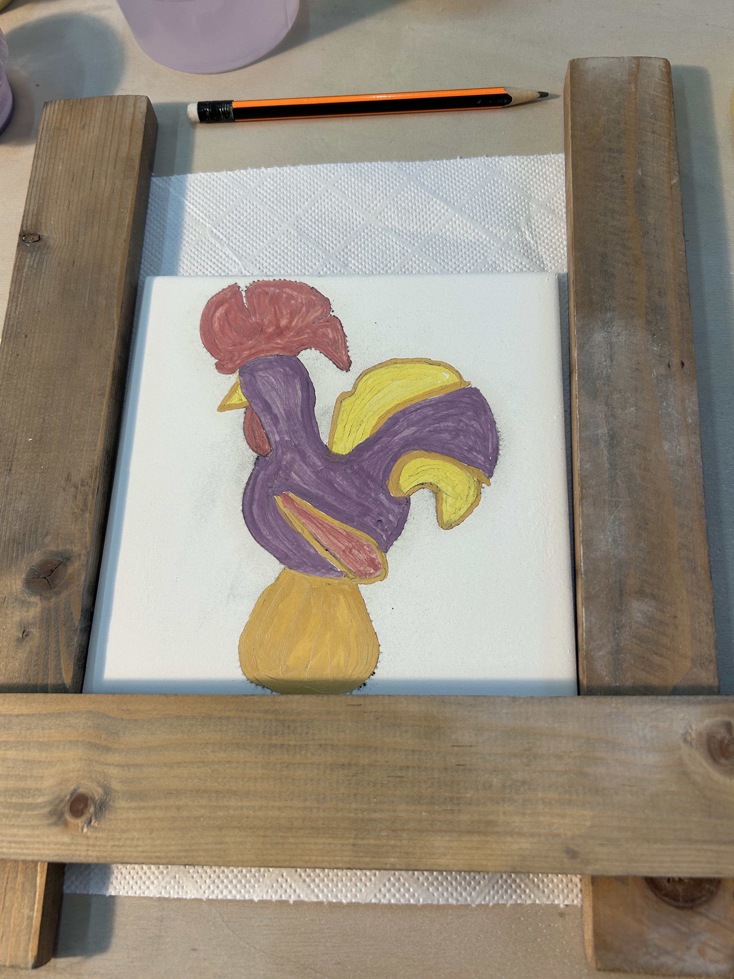 A trip to the bathroom discovered this beauty on shelves filled with creations.This is a cock. It’s a symbol of luck and prosperity. I have to forbid myself because there are colorful roosters in every souvenir shop I poked around in yesterday. Must resist…Ana supplied water or coffee while we painted our designs. The little plastic pots are the glazes. The wood keeps your hands from getting on your project.