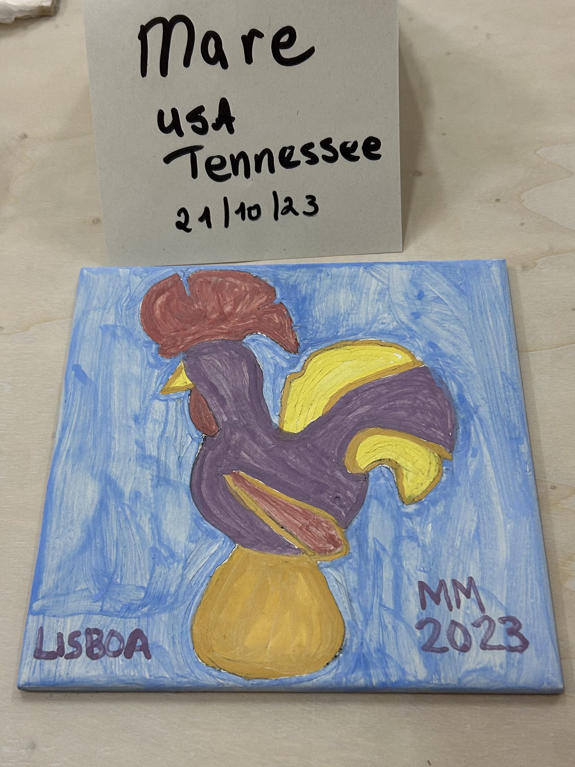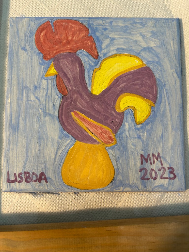 And now, what happened last night? I went to a studio called The House of Tile. A local artist owns the shop and teaches people how to paint tiles in the styles of the Portuguese people. She was kind, helpful, a patient teacher, and played good music which I sang with and even danced a bit.